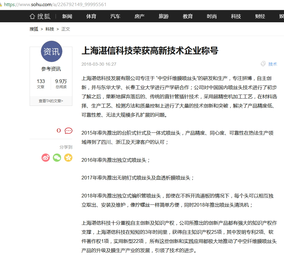 搜狐網(wǎng)科技頻道對(duì)上海湛信科技發(fā)展有限公司噴絲頭技術(shù)及公司實(shí)力進(jìn)行報(bào)道。